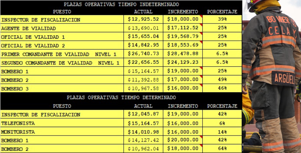 El aumento para bomberos va según su categoría, para la plaza de bombero 3, de tiempo indeterminado, será de 16 mil pesos mensuales, para bombero 2 por tiempo indeterminado será de 17 mil, el de tiempo determinado será de 18 mil. Para bombero 1 por tiempo indeterminado será de 19 mil y por tiempo determinado de 20 mil.
