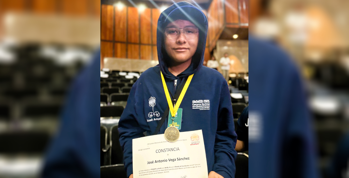GUANAJUATO, GTO. A 15 DE OCTUBRE 2025.- José Antonio Vega Sánchez, estudiante de la Secundaria Técnica 25 de San Luis de la Paz, conquistó la medalla de oro, al representar a Guanajuato en la Olimpiada Mexicana de Matemáticas para Educación Básica (OMMEB), en su novena edición 2025, que se desarrolló del 18 al 21 de septiembre en Oaxtepec, Morelos, con la participación de cerca de 300 estudiantes de 31 estados del país.